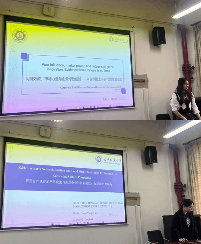 孟洪培同学的论文《同群效应、市场力量与企业绿色创新——来自中国上市公司的经验证据》,基于中国上市公司面板数据,实证检验了行业同群压力与市场竞争强度对绿色技术投入的交互影响。研究发现,适度竞争环境下同群效应可显著驱动企业绿色创新。孙美怡同学分享了《研发合作伙伴的网络地位和焦点公司的创新绩效:知识溢入视角》,运用社会网络分析法,揭示了合作者的中心性与结构洞特征对企业知识吸收能力的差异化影响。