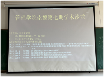 在会场二中,首先分享的是来自21级的刘永民介绍自己题为《供应链集中度与机械设备企业创新绩效的研究——基于数字化转型的调节机制》,论文拟构建以企业数字化转型为调节变量的供应链集中度—企业创新绩效模型,探究机械设备企业供应链集中度的变化特征对企业创新绩效的影响机制。随后是来自21级的欧阳林玉同学,汇报主题为《企业危机类型与回应策略匹配性对消费者负面口碑传播意向的影响:负面情绪的中介作用》,研究从企业危机类型、回应策略、负面情绪、负面口碑传播等视角,从企业危机类型出发,探讨危机类型和回应策略的匹配如何影响消费者负面口碑传播意向。来自21级的徐灿同学,介绍了论文《平台促销模式下的库存策略优化研究》,构建了一个商家和一个网络平台组成的销售系统,在随机需求下,考虑网络代销平台的促销活动的影响,利用博弈论研究了两种库存模式下商家的定价与库存决策以及网络平台的返利优化等供应链运作策略。第4位分享者是来自21级的曹佩佩同学,在她的论文《碳补贴政策对双渠道绿色供应链成员行为决策的影响》中,该研究基于文本因果关系和主题挖掘识别出数据安全风险系统的影响因素及关联关系,采用模糊认知图描述和模拟数据安全风险影响因素的作用机制。第5位是来自21级的肖雅雯同学,论述题目为《网络外部性下考虑CSR和行为因素的绿色供应链决策研究》,构建了由零售商主导的一个绿色产品制造商和一个零售商组成的二级供应链模型,并进一步考虑了制造商承担CSR和零售商的行为因素对绿色供应决策的影响。最后一位是20级的王凯悦同学,汇报主题为《考虑产品质量水平的双渠道供应链同价决策研究》,研究考虑产品质量水平的双渠道供应链,构建Stackelberg博弈分析,对双渠道零售商线上和线下渠道同价销售的集中和分散决策进行比较,并提出契约协调策略。