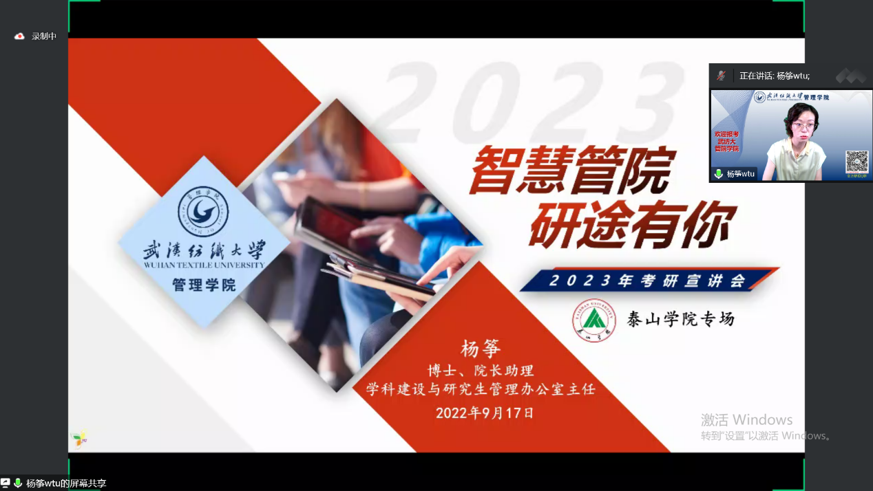 2022年9月17日,伟德国际1946源于英国杨筝博士为泰山学院举办了线上考研宣讲,考研上岸的优秀研究生徐瑞杰,李继华也作了心得分享。