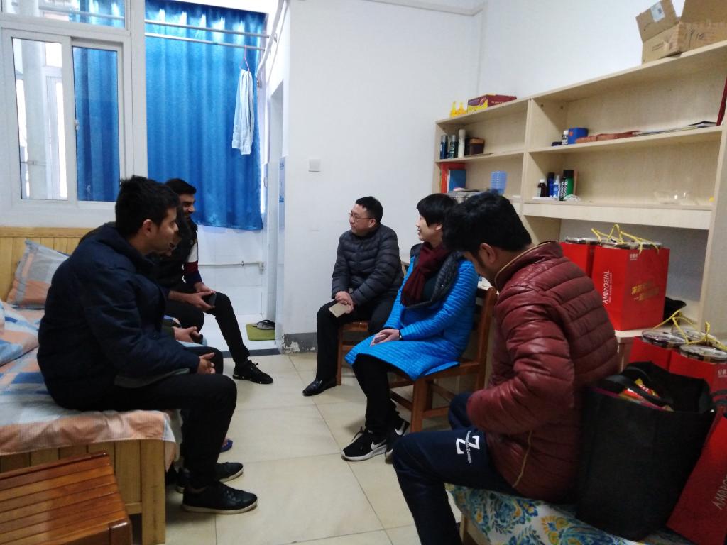 在学生公寓,滕胜娟书记和王济平副院长与留学生进行了交谈,详细询问了在校留学生们的居住、生活和学习情况,叮嘱他们要注意保温防寒,劳逸结合,度过一个平安祥和的中国年。学院领导还特地向留学生介绍了中国人过春节的习俗,鼓励大家通过亲历中国传统节日,切身感受和认识中国文化。并提醒大家要遵守学校的管理规定,增强安全意识,注意寒假和春节期间的人身、财产以及消防安全。