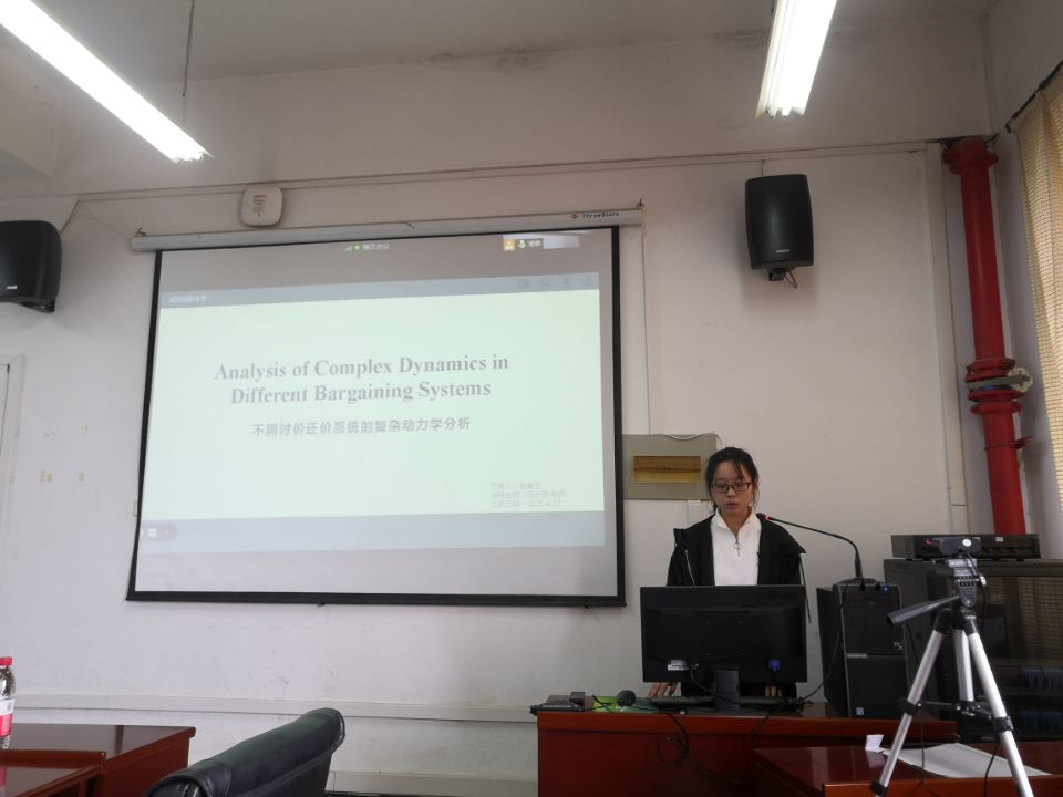 包春玉同学以《Analysis of Complex Dynamics in Different Bargaining Systems》为主题,以供应链成员的讨价还价行为为研究对象,研究了讨价还价系统的稳定性。她结合自己的学习经历,将论文的选题,实验,修改,创新等方面的经历生动的讲述出来,虽然论文中的模型对于外行人来说相对复杂和难以理解,但是这也丝毫不影响同学们被她讲的内容所深深吸引。